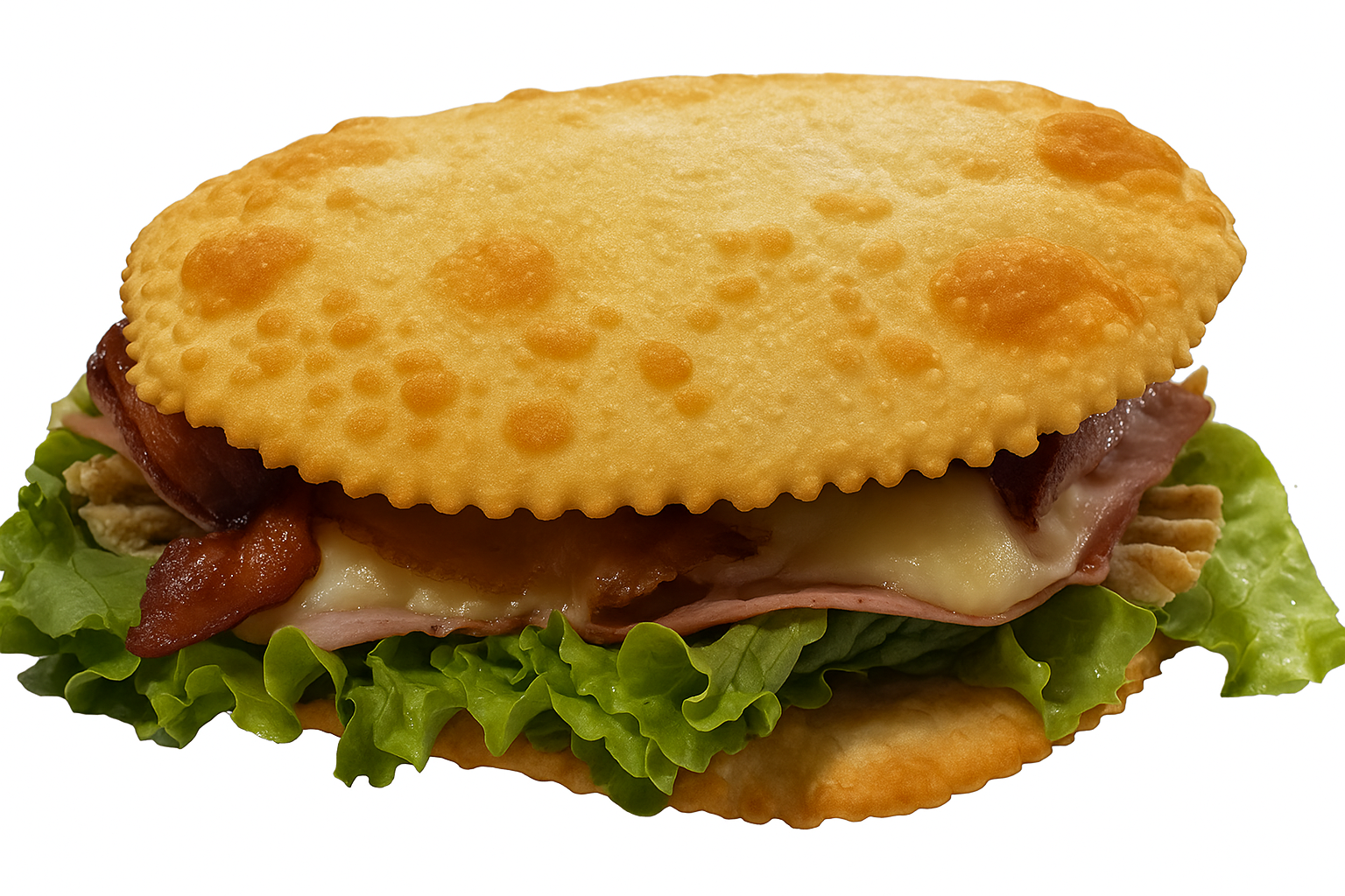Duas massas recheadas com queijo, alface, tomate, dois hambúrgueres, presunto, queijo e bacon