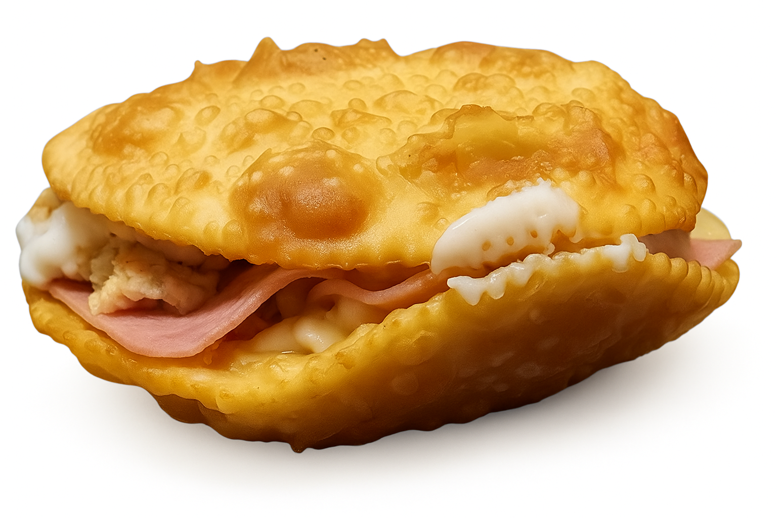 Duas massas recheadas com queijo, hambúrguer, frango, presunto, queijo, alface e tomate.