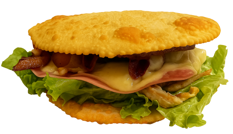 Duas massas recheadas com queijo, hambúrguer, frango, presunto, queijo, bacon, ovo, alface, tomate e milho.