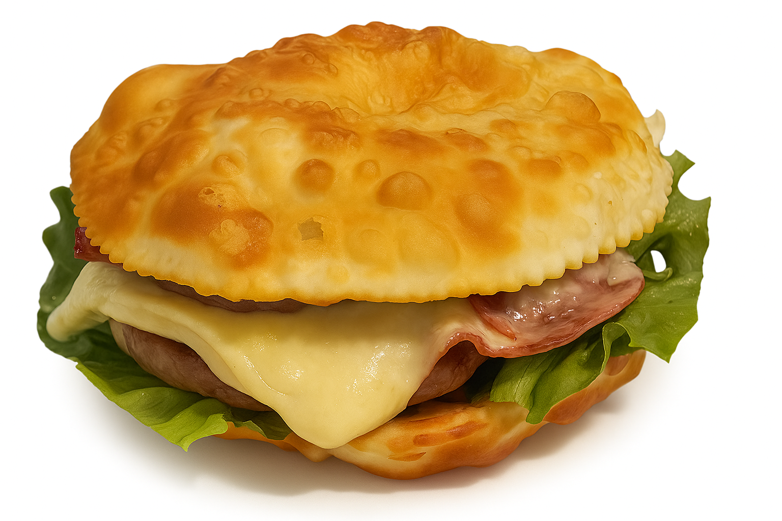 Duas massas recheadas com queijo, alface, tomate, milho, ovo, dois hambúrgueres, presunto, queijo e bacon.