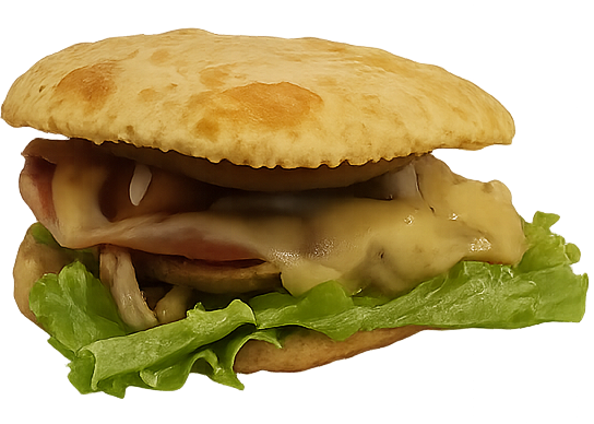Duas massas recheadas com queijo, ovo, dois hambúrgueres, presunto e queijo.